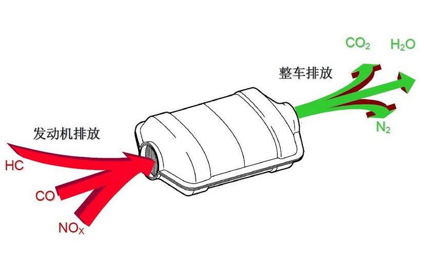 İçten yanmalı motorların (örneğin, otomobil benzinli motor) egzoz gazlarının üç yollu dönüşümü için uygun bir katalizör bileşimi, bir taşıyıcı üzerinde iki ayrı kaplamaya yerleştirilmiş bir katalitik malzeme içerir.